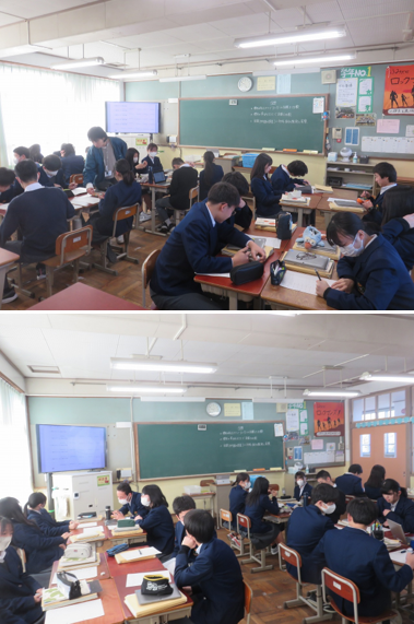 3年6組の数学は、標本調査を行いました。教科書の問題で「みかんの重さ」について、各自で調査した結果をグループで共有し、グループ全員の結果を踏まえて「標本の大きさと結果」について分析しました。