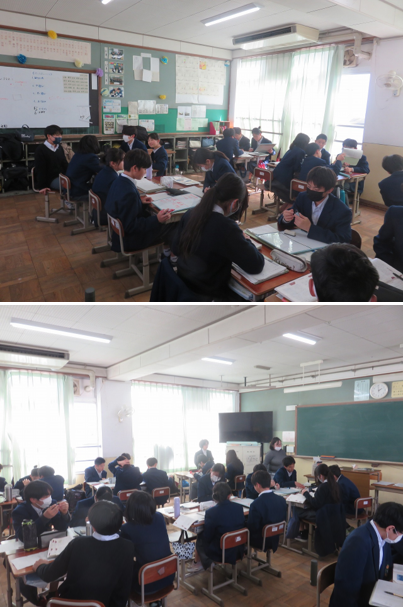 1年7組の国語は、「幻の魚は生きていた」を読み,その要旨を各自でワークシートにまとめ、グループの仲間の意見も聴き、ホワイトボードにまとめました。