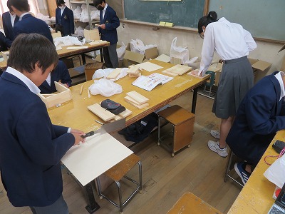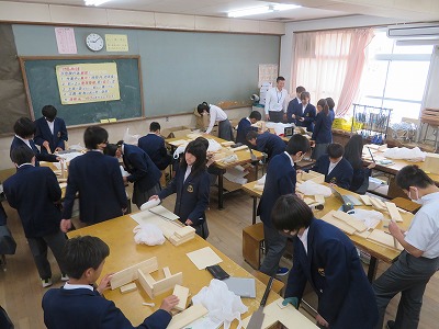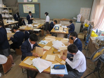 技術室を覗くと、2年7組の生徒のみなさんが、1年生の時から作り始めて作品の続きに取り組んでくれていました。