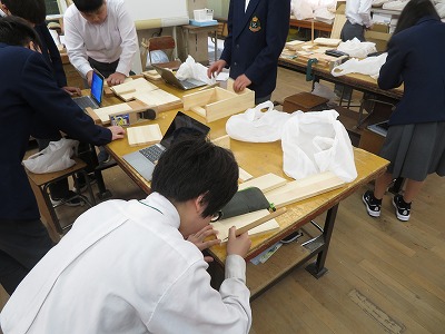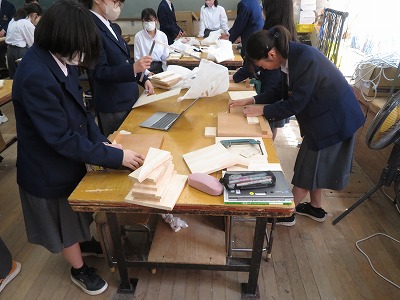 2年2組が技術で、材料加工に挑戦する姿を見せてもらいました。1年生からつくりはじめた作品の組立がいよいよスタートしました。