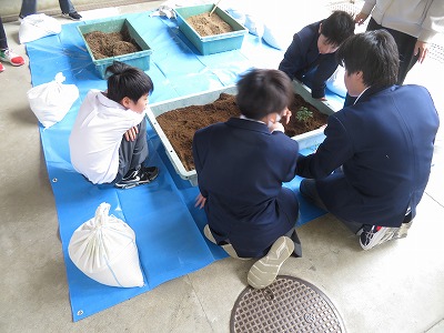 3限、1組は生活の時間、渡り廊下で、野菜(ピーマン、ナス、オクラ、キューリ、トマト)の定植をしました。水やりや施肥など、大切に育ててあげてください。