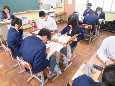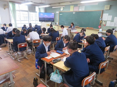 教室の中に入って、何をやっているのかを確認すると、因数分解のジャンプ問題に挑戦をしていました。一人ひとりしっかり問題に向き合い、分からなことは、仲間に質問をしながら、しっかり取り組めていました。東京大学の佐藤学先生は、教室はワイワイガヤガヤで活発よりも、「しっとり」している時に、子どもの学びが促進されると仰っていますが、まさに「しっとり」した教室の雰囲気を感じることができました。