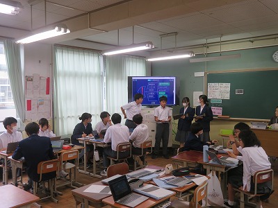 3年3組の英語の授業を廊下から見ると、生徒のみなさんが教室の前に立ち、発表している姿に目が留まりました。