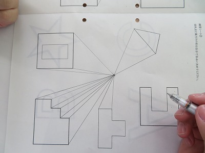 本時は、「消失点を決める⇒描きたいものの正面の形を描く⇒角にあわせて手前から奥に向かう線を引く⇒奥行きの形を描く⇒不要な線を消す」という順番で一点透視図法を描く練習に取り組みました。