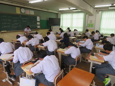 1年2組は、これまで学習した「変数xを不等式と数直線」で表す問題(小テスト)に取り組んでいました。