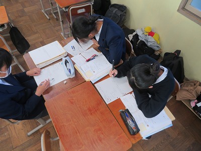 3年5組は、三角形の相似条件を使った証明に取り組んでいました。三角形の相似条件のどれが使えるか考え、一生懸命答えを導き出そうとしていました。