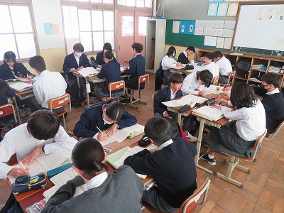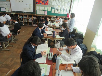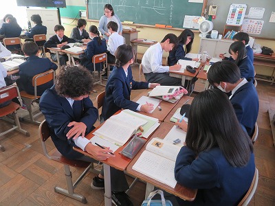2年6組の国語は、『平家物語』を教材とし、「扇の的の概要について理解する」ことを目的とし、授業が進められていました。
