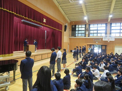 6時間目に、体育館で生徒会本部役員および学級役員の認証式を行ました。