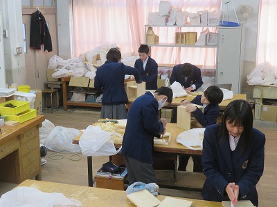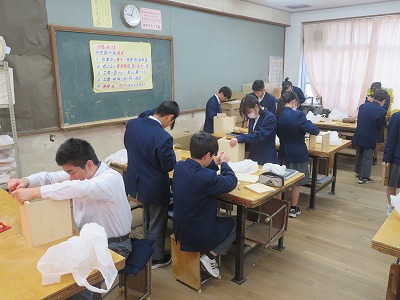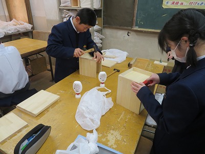 材料加工領域の学習で、一枚板を用いて、自分がつくりたい“もの入れ”の作成をしています。