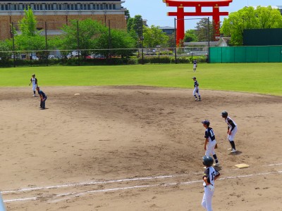 野球部春季大会の準々決勝が5月4日岡崎グラウンドで行われました。試合は10時30分に始まりました。1回表、樫原は守備から始まり、投手はIさん(3−6)力投が期待される中、立ち上がり前に下京打線に苦戦して1アウト2塁からセンター前に運ばれ1点を先制されました。さらにエラーで2塁を奪われ、ピンチが続き下京打線につかまり1点を追加される。その後も下京打線につかまり4−0とリードされました。1回裏、樫原は1点でも返したいところですが、Iさん(3−6)、Nさん(3−5)、Yさん(3−4)の3人で攻撃が終了。2回表、ノーアウト1塁のピンチからレフト前にボールを運ばれランナー1、2塁となり、下京のバント失敗にで1アウトとなりますが、その後センター前にボールを運ばれました。その直後にもエラーで1点追加されるなどし、2回表も相手に4点を奪われる展開となりました。2回裏、何とかしたい樫原の攻撃、Kさん(3−8)がアウトとなり、Mさん(3−3)がボールを見極め出塁しました。しかし、Aさん(3−2)、Oさん(3−2)がキャッチャーフライで二者連続アウトで攻撃を終える。3回表からマウンドにはMさん(3−3)があがりました。下京のゴロをKさん(3−8)が綺麗にさばき1アウト、続く打者もこの回ショートに移ったIさん(3−6)がゴロをアウトにして2アウトにしました。これで流れが経ち切れたかに思えましたが相手チームの勢いが止まらずに、この回ランニングホームランも併せて2点を奪われるてんかいとなりました。3回裏Uさん(3−7)がライトボールを運び1塁へ、そこからチームは本来の力を徐々に取戻し、満塁のチャンスにつなげましたが、2アウト満塁のチャンスYさん(3−4)の放ったサード強襲のあたりも相手の好守備に阻まれアウトとなりました。
