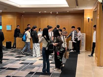 19時から集合時間が始まります。予定を終えた班がホテルに到着し、担任の先生からチェックを受けています。