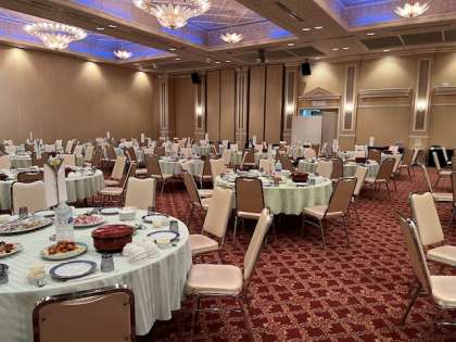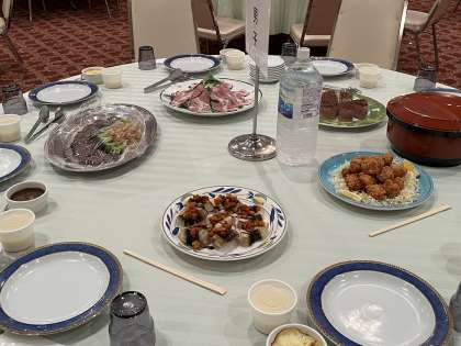 夕食会場です。広いスペースです。食事は卓盛になっています。
