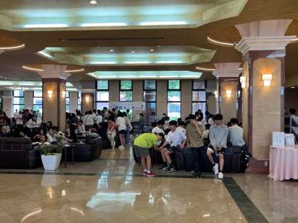 学年レクは8時40分開始予定ですが、雨が降ってきましたので30分遅らせて始める予定です。内容を減らして実施します。雨が止むまでの時間、ロビーで待機しています。