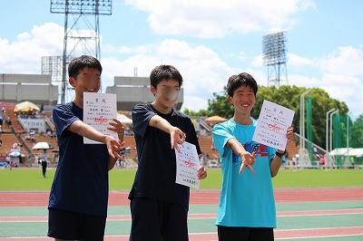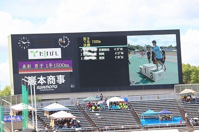 最初の種目だった1年1500m決勝には、Mさん(1−4)とOさん(1−6)が出場しました。2人は最初の300mを上位集団で走っていました。先頭のタイムが1分12秒。700mを5位と7位で通過します。上位は5名ほどの集団になります。向かえた最後の400m。Mさん(1−4)が一気にスパートをかけます。その結果3位入賞しました。Oさん(1−6)も最後踏ん張り7位でフィニッシュ。この結果、Mさんが3位に入り近畿大会への出場を決めました。樫原中からは水泳のYさん(2−5)に続く2人目の近畿大会出場です。表書式はオーロラビジョンに映し出されていました。Mさん、おめでとうございます!!