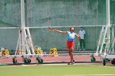 男子円盤投にはMさん(3−6)が出場しました。円盤投には20名の選手が出場し、各選手が3回投げます。その中で一番いい記録を比べて上位8名が決勝に出場できます。Mさんは3投目に28m82を投げて全体の8番目で決勝に進出しました。