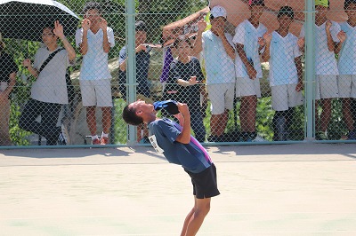 第2試合にはOさん(3−4)・Fさん(3−3)ペアが出場しました。城陽中のペアは第1ペアといって一番力のあるペアです。第1ゲームは落としましたが、第2ゲーム以降は樫原中ペアの底力が発揮されます。Fさんのネット際でのボレーや、Oさんの相手ラケットを弾くほどの力強いショット。気迫でも城陽中を圧倒していて、このペアのいいところが随所に光ったゲームでした。ナイスゲームです。