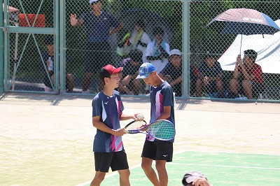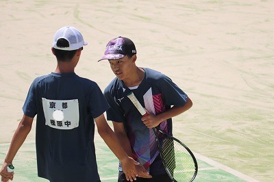 準決勝で敗退した樫原中。悔しい3位という結果になりました。近畿大会出場を本気で目指していましたし、京都市内大会では無敵でしたので、本当に悔しい結果になりました。両チームともハイレベルな試合で、スピードやスピンの効いたショットが何度も見られました。勝利への気迫も熱く、取材班は手に汗を握るとはこのことだと思うくらいでした。惜しくも敗退しましたが、ほんのわずかな差で負けたような感じです。もう一度対戦すれば樫原中が勝っていたかもしれません。熱い試合をありがとうございました。これから、競技を続ける選手とそうでない選手に分かれると思いますが、このチームでここまで戦ってきたことを誇りに持って欲しいと思います。市内予選から今日まで熱い試合をありがとうございました。明日は個人戦です。2ペアが出場しますが、2回戦では第1シード、第2シードと当たると聞いています。しかし、勝負はやってみるまでわかりません。今日のような闘志を前面に出したプレーを見せて勝ちましょう。