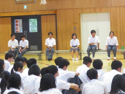 本日、6限目に体育館で3年生がビブリオバトルを開催しました。各クラスの代表者が学年のみんなに自分がおすすめする本について語っていました。運営はすべて3年生の生徒たちが行っていました。質疑応答でも発表者はしっかりと回答していました。発表を聞いていて私も読んでみたいと思った本がありました。とても暑い体育館ではありましたが、3年生の皆さんは、いい雰囲気でビブリオバトルを終えることができました。