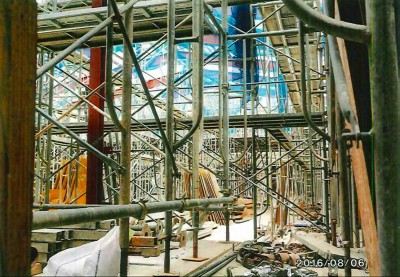 体育館工事は基礎工事が2016年の6月3日より7月7日まで行われ、その後はいよいよ棟上げ工事が開始されます。8月6日には工事用のシートがかけられ中は見えない状態でしたが、何とか中の写真を撮っていただいていたみたいです。この3枚目の写真もなかなか見ることができないレアな写真です。かなり大掛かりな工事だったことが写真からも伺えます。