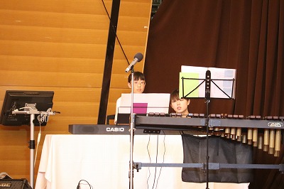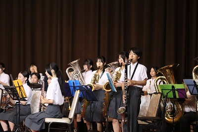 3曲目が終わるとアンコールが起こりました。司会者から「準備しますのでお待ちください」の声が。部員がステージから降りて会場を取り囲みます。曲目は何かな?と思ったら、「ふるさと」の演奏でした。ピアノ伴奏に合わせて部員全員での合唱です。顧問の先生も一緒に唄っています。まちを愛する気持ちが伝わってきて、参加者の心が一つになったと思います。吹奏楽部の皆さん、感動を与えてくれてありがとうござました。