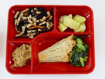 中華五目ご飯、牛乳、鱈のガーリックみそマヨネーズ焼き、小松菜のいため物、ひじきと高野豆腐の煮物、のり塩じゃがバターでした。