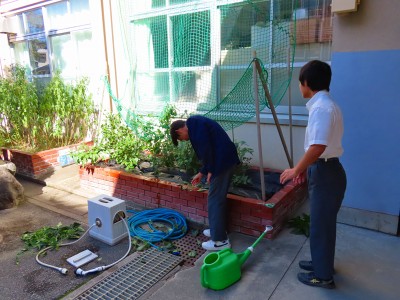 1組は菜園の手入れを行っていました。植え替えや成長した葉っぱを丁寧にまびいていました。後かたづけの後にはしっかりと観察学習をしてました。先日は収穫できた材料をもとにして調理実習を行いました。私も差入れをいただきましたが、とても美味しかったです。1組の皆さん、本当にありがとうございました。ごちそうさまでした。