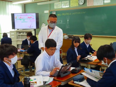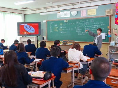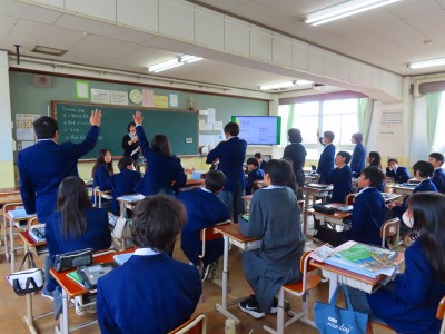 1年生の生徒たちは英語の学習で人物クイズやオールイングリッシュのQ&Aで楽しく英語を学んでいました。