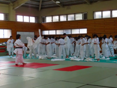 1年生は体育の授業で、これから始まる柔道の授業に向けて正しい柔道着の着方やたたみ方、礼法について学習をしていました。