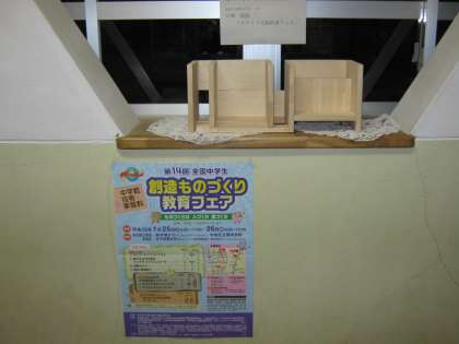 京都府木工チャレンジコンテストにおいて優勝し関西大会に出品した樫原中学校2年生Kさんの作品が優秀と認められ,平成26年1月東京で行われる全国大会に関西代表として出場することになりましたので報告させていただきます。その作品は保健室前に展示中です。ご覧ください。