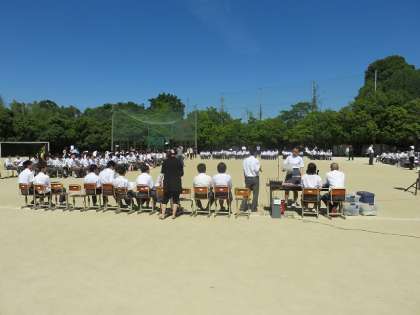 体育館工事中のため、最初で最後のグランドを会場にした生徒総会が開かれました。運の良い(悪い?)ことに雲ひとつない晴天で気温もグングン上がる中での総会でした。こんな中でも生徒のみなさんはしずかに過ごし、議事進行もスムーズに行われました。総会でいただいたご意見は今後の学校生活の中で改善を進めたいと思います。暑い中お疲れ様でした。