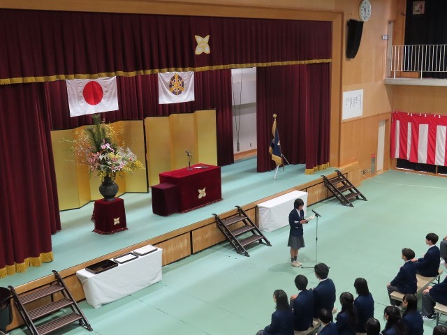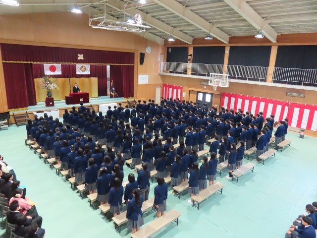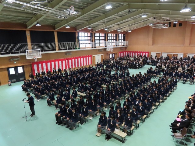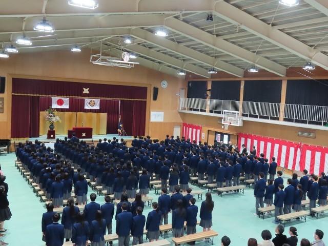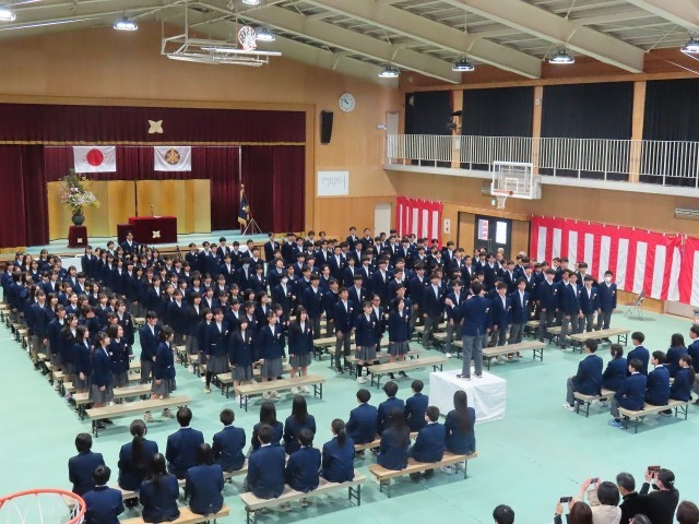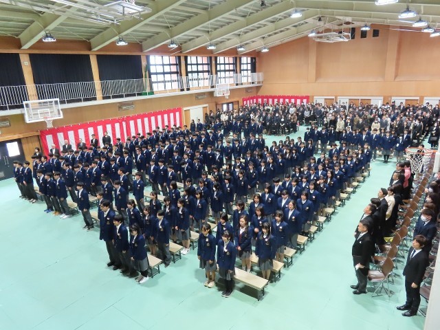 本日、第51回卒業証書授与式が挙行されました。来賓の皆様、保護者の皆様、そして教職員に見守られながら、3年生195名が巣立ちの日を迎えました 。校長先生の式辞は、3年生との数々の思い出が詰まった心温まる内容で、涙ぐむ生徒の姿も見られました。PTA会長の祝辞や送辞、答辞では、これまで成長を支えてくれた多くの方々への感謝の思いがあふれ、会場全体が感動に包まれました 。最後に3年生から贈られた合唱には、一人一人の3年間の思いが込められ、深く心に響くものがありました 。これからは、それぞれ進む道は違っても中学校3年間で得た力をもとに、自分の力で未来を切り開き、悔いのない人生を歩んでください。私たちは、あなたたちのこれからをいつまでも応援しています 。