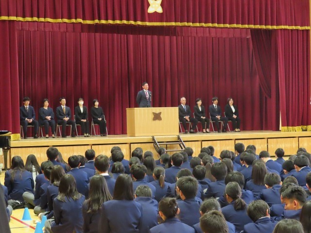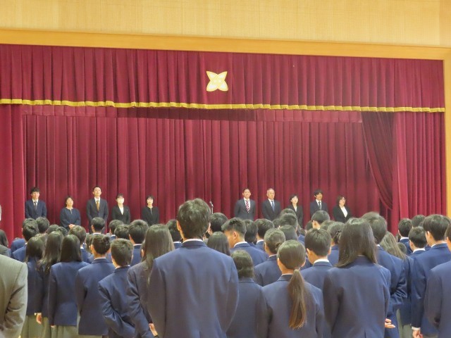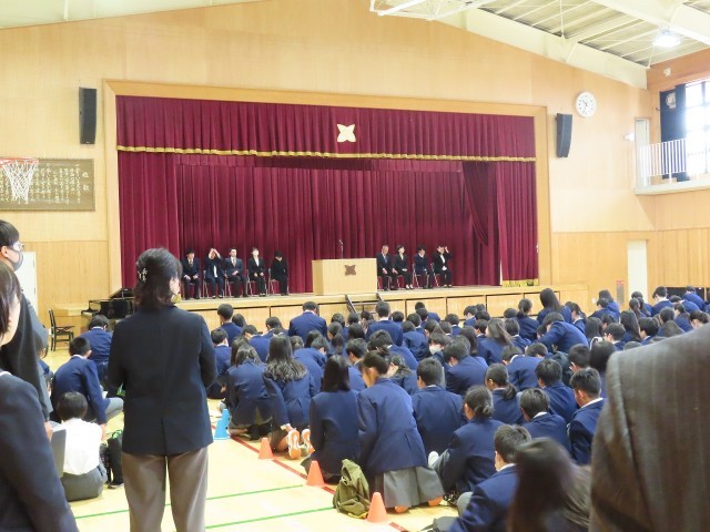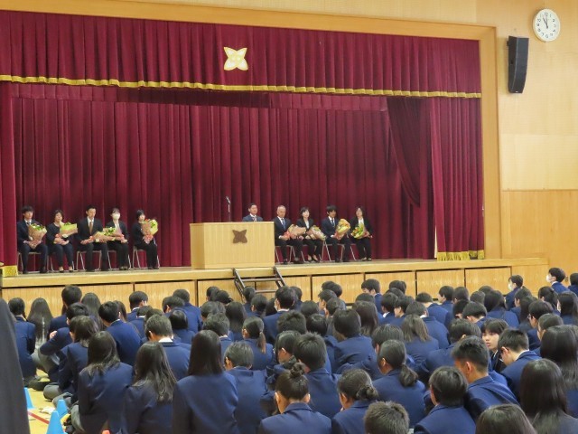 本日、樫原中学校では午前10時30分より離任式を執り行いました。式には多くの卒業生も参加し、体育館は温かな雰囲気に包まれました。本年度は転退職される先生方が15名おられ、そのうち10名の先生方にご参列いただきました。式では、生徒・教職員が心を込めて、これまで樫原中学校の教育活動や学校の発展にご尽力いただいた先生方を盛大にお送りすることができました。長年にわたるご功績に心より感謝申し上げるとともに、先生方の新天地でのご健康とさらなるご活躍を教職員・生徒一同、心からお祈りいたします。