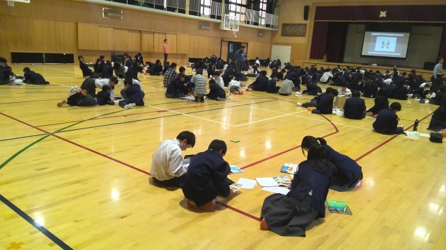 学年で体育館に集まり、1人2冊、好きな教科の教科書を持ってきて、自分にとって興味のあることを選んでみよう!という取組でした。