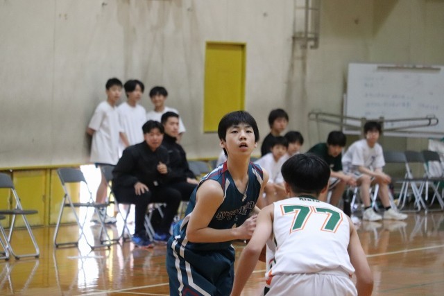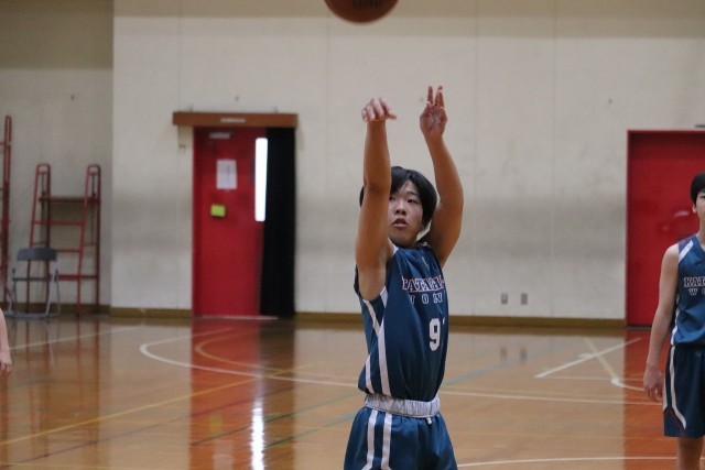 最初に得点したのは北野中。開始1分で0-5と北野中が先手を取りますが、開始2分にWさん(3-8)の力強いドライブが相手のファールを誘いバスケットカウント。フリースローを2本とも正確に決めます。その後も、Kさん(3-4)がフルースローを決めて3-5。5分すぎにはKさん(3-4)のフェイクからのミドルシュートが決まり5-5と追い付きます。残り2分となってからは、Hさん(3-2)がオフェンスリバウンドを粘って7-5と逆転。終了間際にもゴール下からしっかり決めて10-7。樫原中が3点リードで第1ピリオドを終えました。