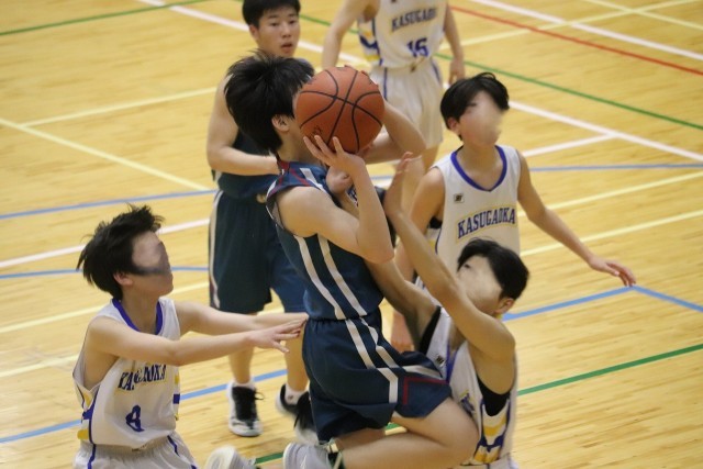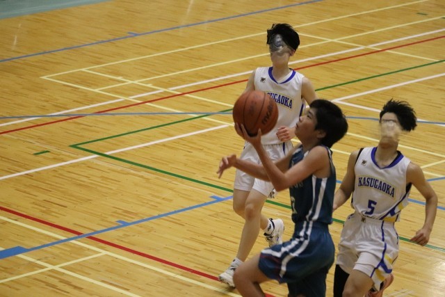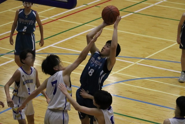 開始10秒、Sさん(3-7)のフックシュートで樫原中が先にスコアを動かします。開始1分、Wさん(3-8)がこの試合初めての3Pを決めて37-15。樫原中の高い位置からのディフェンスで相手チームからボールを奪うシーンが増えてきました。ボールを奪ってからは速攻の形が多くなり、それぞれの選手の個を活かしたプレーが目立ってきます。ディフェンスでは、Kさん(3-4)の体を張ったプレーが印象的でゴール下を支配します。また、ダブルチームに行くタイミングも良く相手に思うようにプレーさせません。この試合、Sさん(3-7)が好調で、3Pシュートやブロックショットなど要所で活躍します。第3ピリオドだけで13点をつける猛攻で一気に勝敗の行方が樫原中学に傾きます。