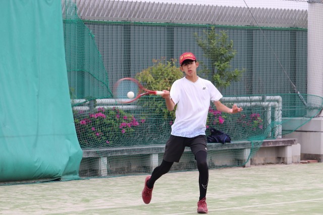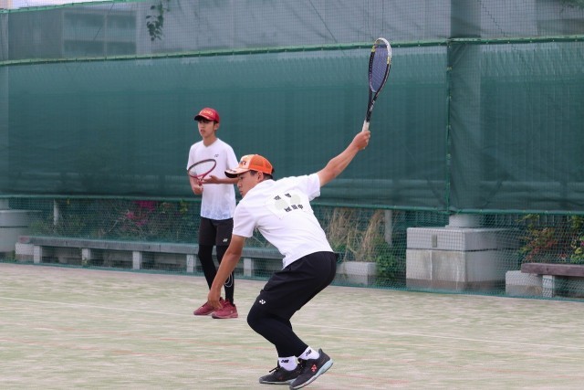 第2ペアには、Iさん(3-3)Iさん(3-8)ペアが出場しました。この試合に負けると後がない樫原中。最初の2ゲームを取られたものの、Iさん(3-8)のコースを狙ったショットやサービスエースで2-2のタイに持ち込みます。第5ゲームを落としましたが、第6ゲームではIさん(3-3)のナイスボレー、最後はストレートのショットが決まり6-4と取ります。しかし、ファイナルゲームでは、Iさん(3-8)のサーブなどで途中4-5と接戦に持ち込むものの、最後は相手ペアのコースを狙ったショットに翻弄され5-7と惜しくも落として負けてしまいました。