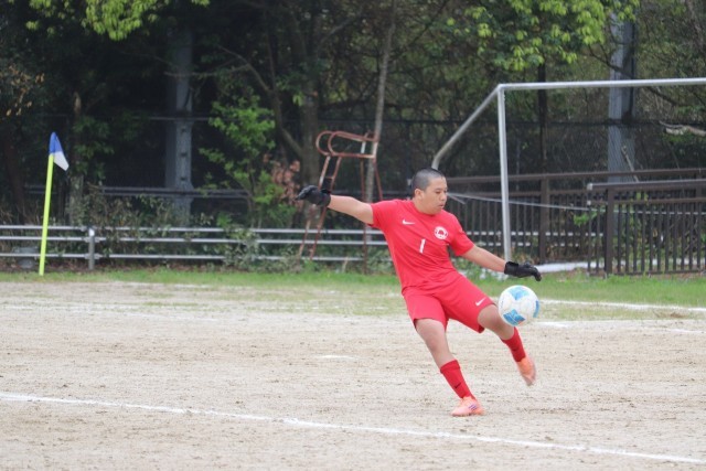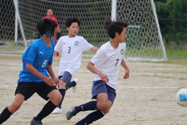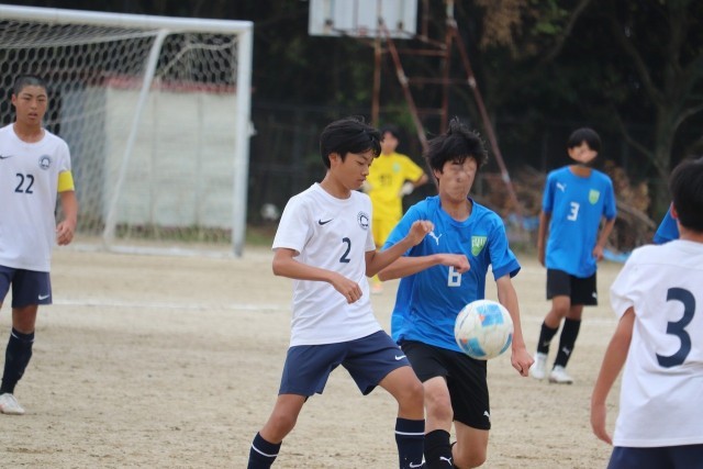 ゲームは洛西陵明小中学校が主導権を握ります。前半開始から、相手チームの左サイドを中心に何度も攻撃されます。それでも前半7分樫原中フリーキックのチャンス。Fさん(3-5)がゴール前にいいボールを上げましたが惜しくも合わず。その後は、一方的に攻められる展開に。何本もシュートを打たれますが、Iさん(3-5)、Fさん(3-3)、Iさん(3-4)のクリアーや、Kさん(3-8)の身体を張ったシュートブロックなどで防ぎ得点を許しません。そんな展開の中、樫原中はワンチャンスを狙います。開始20分には、Fさん(3-3)が相手ゴールキーパーの1対1になりますがシュートは枠を捉えきれず。続く24分にもチャンスが生まれます。Fさん(3-3)のロングパスに反応したキャプテンMさん(3-7)が相手ゴール左に見事なシュート。守りに守っていた樫原中が先制に成功します。その後も、相手に再三のピンチを作られますが何とか守りぬいて1-0で前半を終えます。