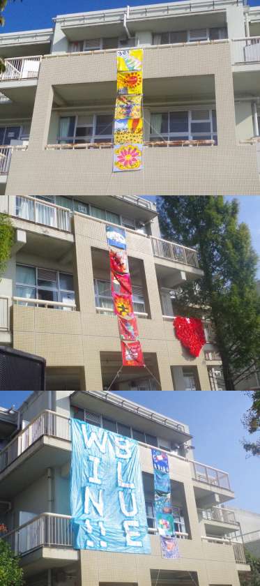 赤・黄・青ぞれぞれのシンボルデザインが各棟に取り付けられています。