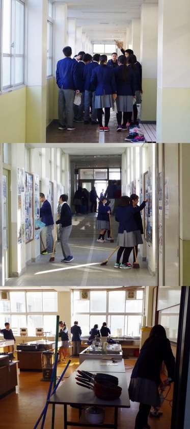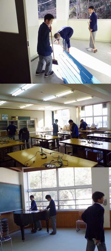 12月よりはじまった縦割り清掃ですが、2回目の今回、14時10分5限の授業が終了すると同時に、縦割り清掃開始を合図する「準備の曲」が流れ出しました。