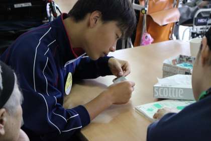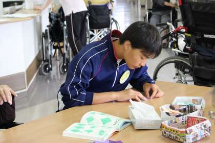 利用者の方とのお話や色紙を作る作業をしています。非常にやさしく・丁寧に接することができ、喜んでおられます。
