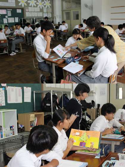 読み聞かせの方法や心構えを聴いたあと,仕掛け絵本と仕掛けのない絵本の読み方の見本を見たあと,夏休みの各自の作品を使って班のメンバーやクラスの仲間たちに披露しました。