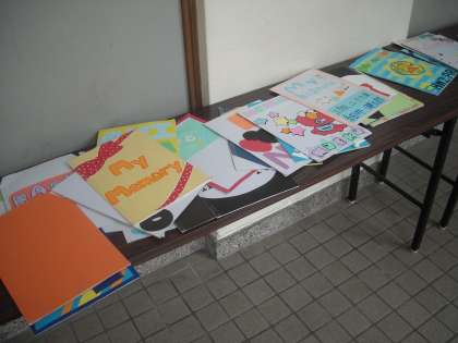 3年生のA棟の渡り廊下の壁際に3年生家庭科の作品「生い立ちの