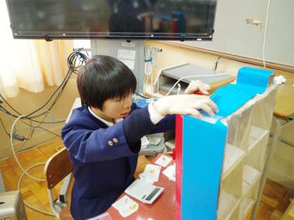 担任の矢野先生と作り上げた自信作の商品棚を披露し説明してくれました。