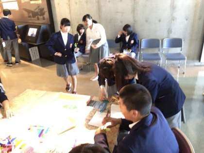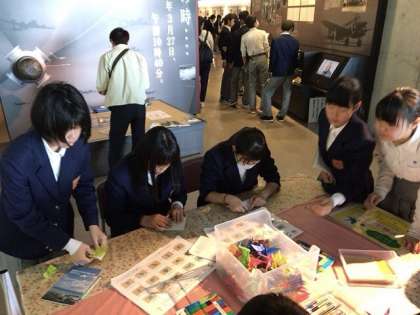 平和の折り鶴をそれぞれの思いを込めて折っています。