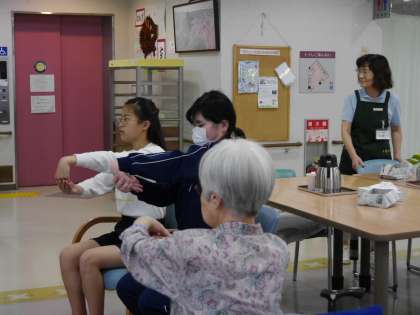利用されている方と一緒に体を動かしたり、お話をしたりしています。