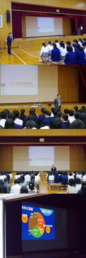 高校の先生からの説明のあとは、進路指導主任の伊藤より昨年度の進路状況やこれからの予定について紹介されました。また、入試制度や出願の仕方、奨学制度についても説明がありました。