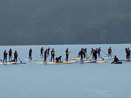 スタンド・アップ・パドルボートの略でボードの上でバランスをとって、パドルで進むスポーツに挑戦しました。一度も水につからず出発点まで戻れた人もいたようです。