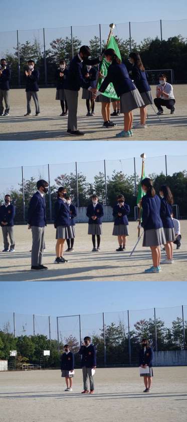 生徒会旗が前生徒会長から新生徒会長へ渡されました。