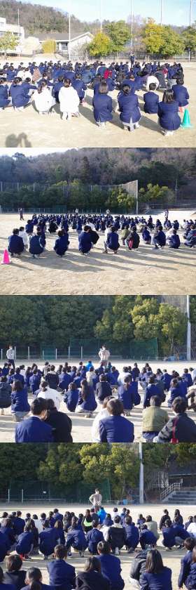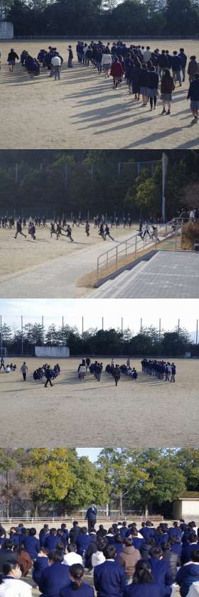 グランドへの避難は,全校生徒一斉での避難ではなく,学年毎に集合場所をかえて移動をしました。避難完了に要した時間は,放送指示が入ってから2分31秒〜40秒と前回の避難訓練の反省を生かした素早い避難行動となりました。