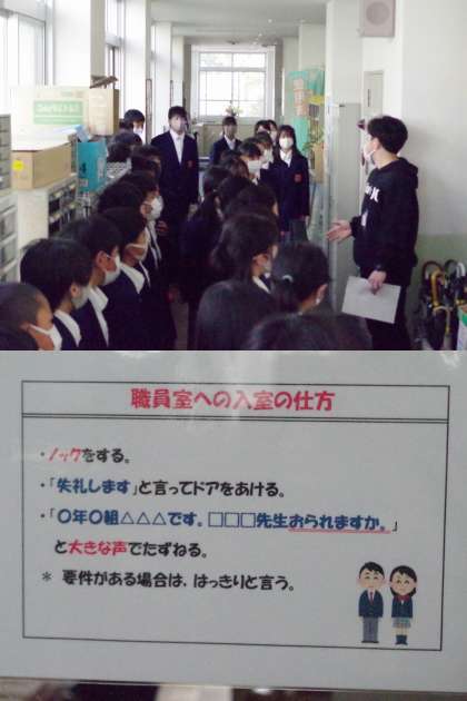 教科での特別教室も多く,授業ごとに移動があります。その他にも,ゴミ捨て場,給食室,武道場,お茶置場など覚えることがたくさんあります。また,職員室への入り方の勉強もしました。最初は1人では心細いと思います。友達と協力して頑張りましょう。